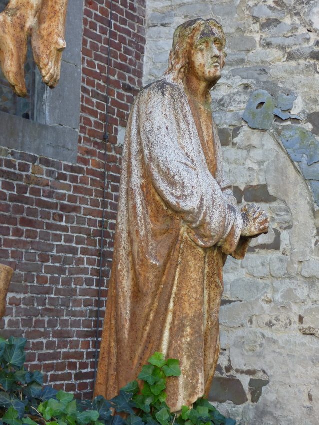 Grand calvaire en fonte composé du Christ en croix, de la Vierge Marie et de Saint Jean situé sur le côté de l’église St-Sébastien à Linkebeek.