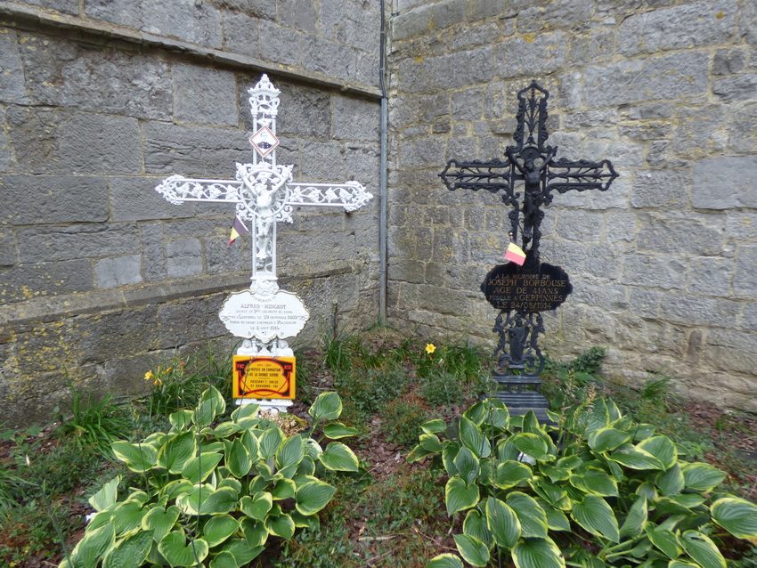 Une grande croix funéraire en fonte dans le cimetière autour de l’église St-Michel-et-Ste-Rolende à Gerpinnes pour la sépulture d’une personne fusillée en 1914.