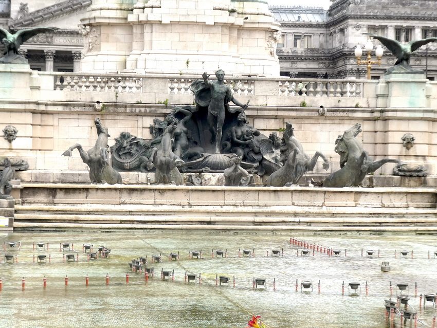 Le tout est complété par la fontaine qui symbolise le Río de la Plata et ses affluents, le Paraná et l’Uruguay, représentés par les sculptures en bronze de deux hommes âgés qui versent de l’eau avec des pichets.
