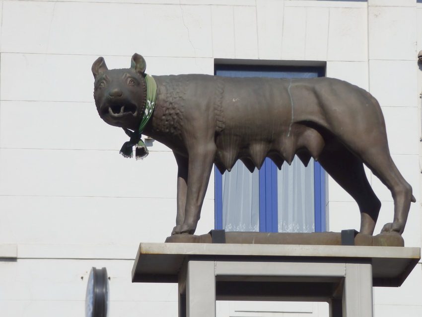 Il s'agit d'une copie de la Louve capitoline, sans Romulus et Remus. La louve était placée sur un piédestal en pierre bleue dû à l’architecte Depelsenaire au centre du carrefour. Malheureusement, le socle a été ébranlé plusieurs fois par des véhicules. On a donc installé la statue en hauteur sur une structure en métal.