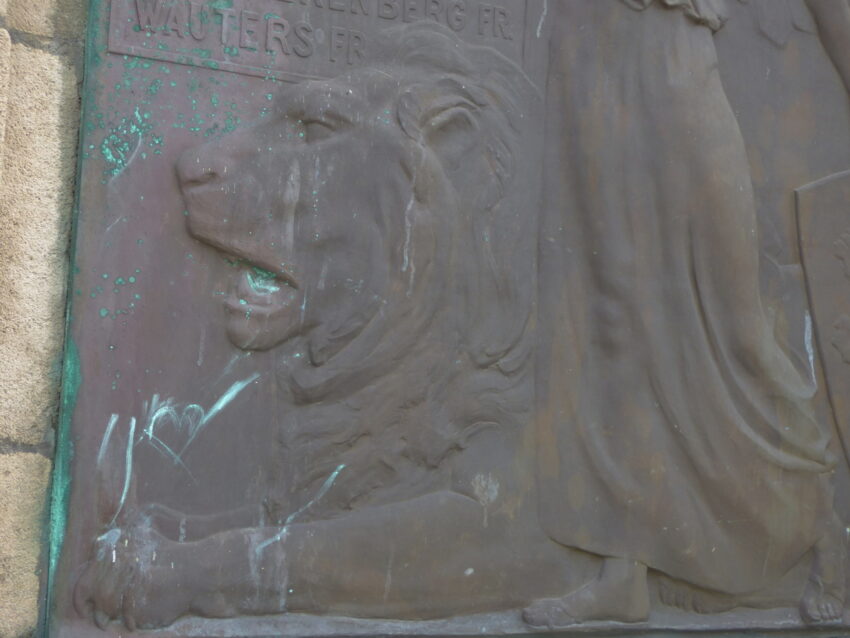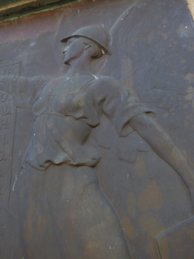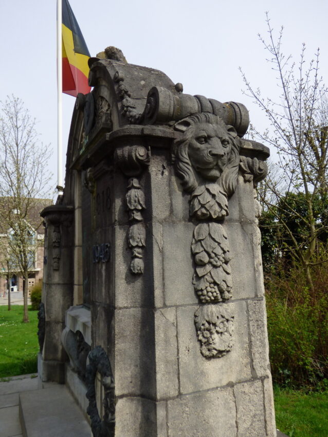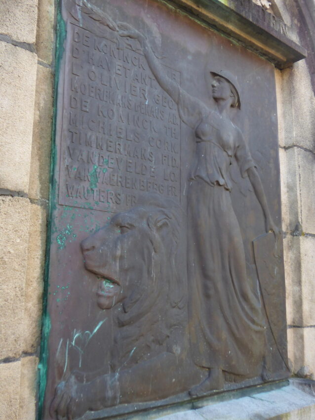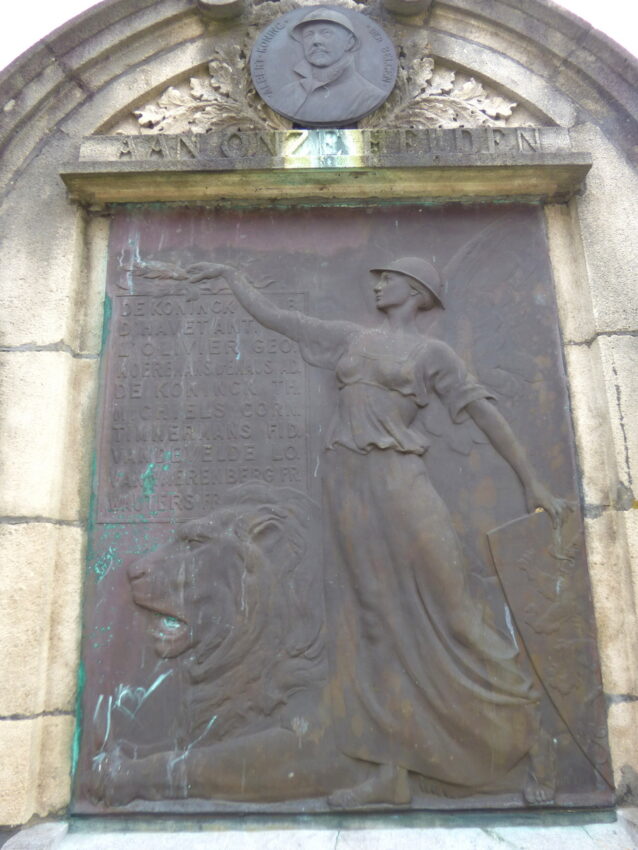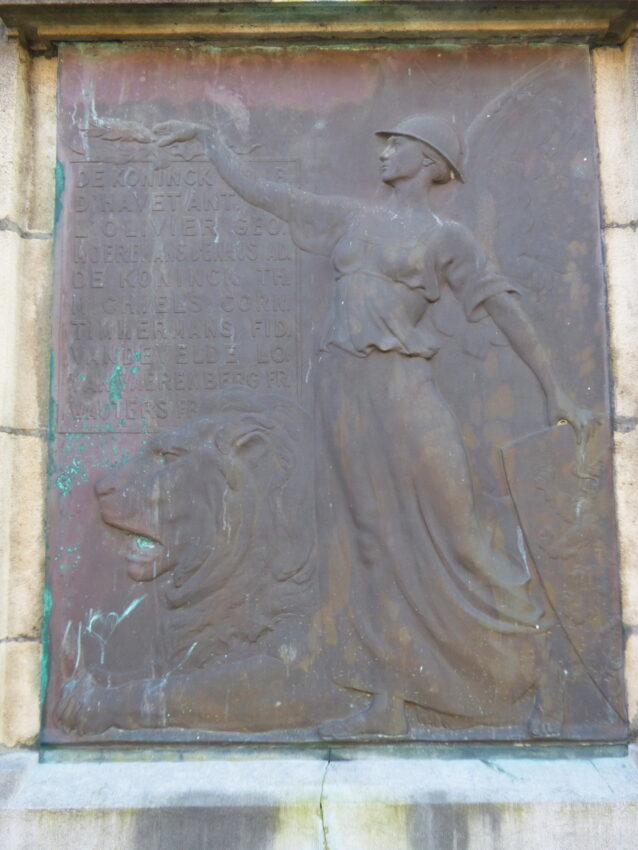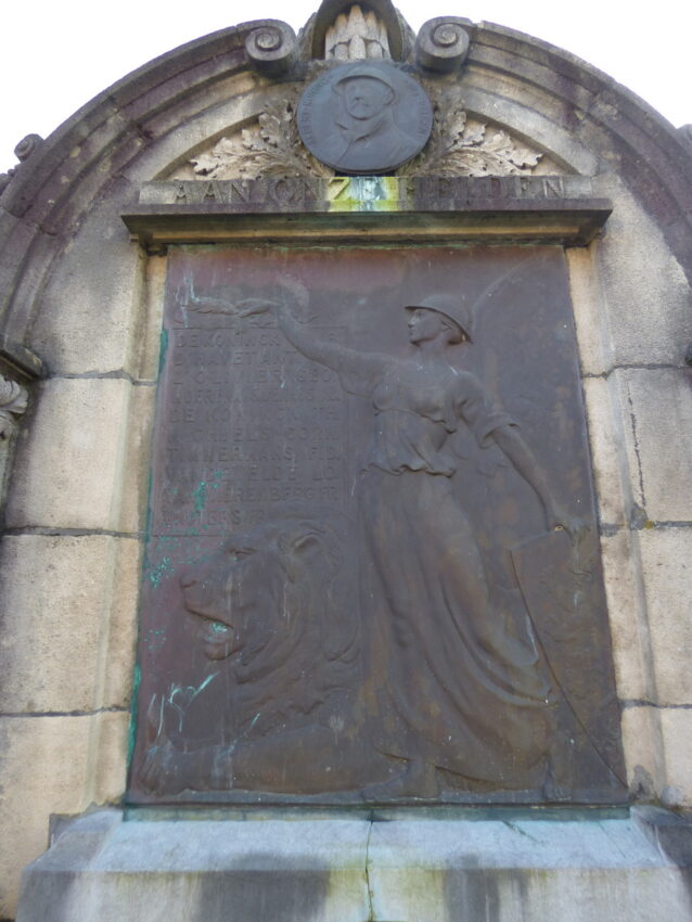 Au centre se trouve une plaque rectangulaire en bronze avec un bas-relief représentant une Victoire ailée et casquée, symbole de la Patrie. Elle tient une couronne de laurier au-dessus des dix noms de morts et dans sa main gauche elle tient un bouclier avec les armoiries de la Belgique. À ses pieds repose le lion belge.