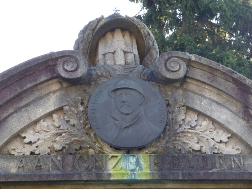 Au-dessus de cette plaque se trouve un médaillon en bronze avec l'image du roi Albert et l'inscription : "Albert Koning der Belgen".
