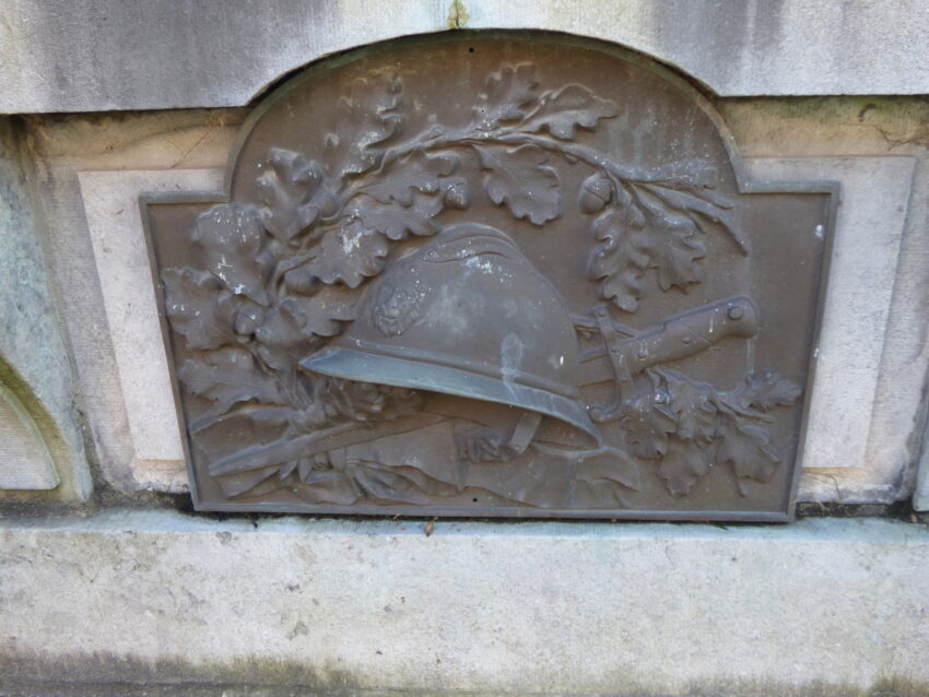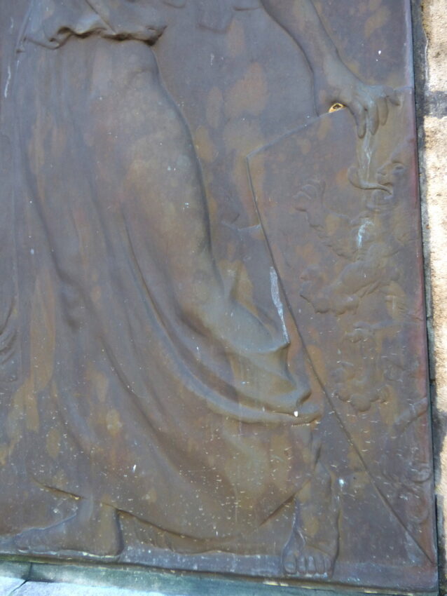 Au bas se trouve une plaque de bronze avec un bas-relief d'un casque et d'une épée.