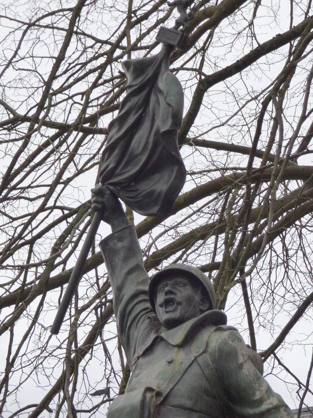 Monument commémoratif pour la guerre 1914-1918 et complété avec les noms de 1940-1945. Un soldat en bronze brandit le drapeau.
