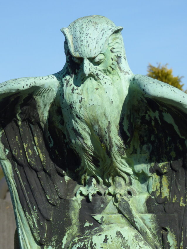 La figure du défunt est représentée de profil et est placée sous les ailes protectrices d'un hibou, serrant dans une griffe un compas, un fil à plomb et une équerre, les emblèmes d'un architecte et de la franc-maçonnerie.